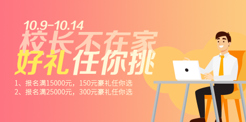 ![]() 活动时间:10月9日-10月14日 活动详情: 1.报名满15000元,150元豪礼任你选 2.报名满25000元,300元豪礼任你选 课程热线:025-83236519;15312023783 (责任编辑:admin) |